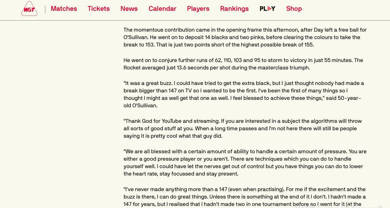 奥沙利文还谈到这次创造153分新纪录的初衷:“这次打出153分的感觉非常特别。起初我无所谓,但当我想到没人曾在电视直播中打出超过147分的成绩时,我决定成为首个做到这个的人。从我打进第一颗黑球开始,我就有了这个目标。斯诺克运动中,我已经拥有多项纪录并经常成为纪录创造者,这次我也想把它收入囊中。”