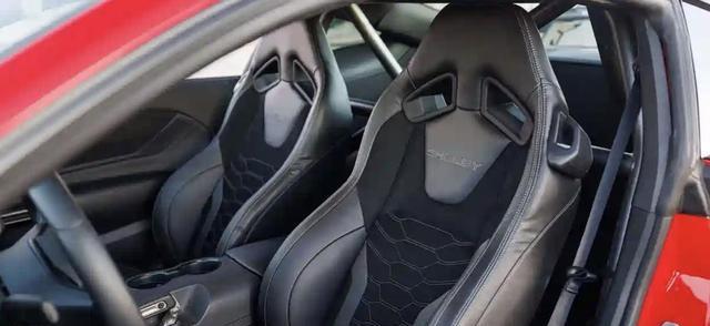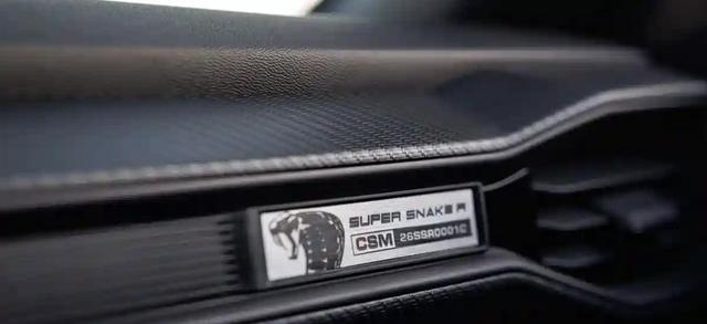 进入车内,福特Mustang Shelby Super Snake-R车内采用了黑灰色Alcantara面料铺陈,大面积碳丝编织的黑色碳纤维装饰面板,通过不同种材质也营造出丰富的层次感。中控台配备了植绒面料的赛车方向盘,还加入了银色的换挡拨片,炮筒式的全液晶仪表、炮筒式的空调出风口,还配备了印有Shelby标识的桶形座椅,其采用Alcantara+皮革拼接包装,另外车内还安装了防滚架,并在排挡杆以及副驾前方等处配备有专属铭牌。中控台还配备了三辐式多功能方向盘,操控岛还加入了光头金属样式的shelby六速手动换挡拨杆。
